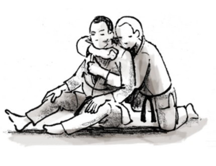 DESCRIPTION : Tori est à genoux derrière Uke, genou droit levé. Il passe son bras droit devant la gorge de Uke et le dos de sa main gauche sur l'épaule gauche de Uke. Il rejoint ses 2 mains, paume face à face et place le côté droit de sa tête sur la tempe gauche de Uke. L'étranglement se fait en déséquilibrant Uke vers l'arrière en tirant le bras droit dans la même direction.