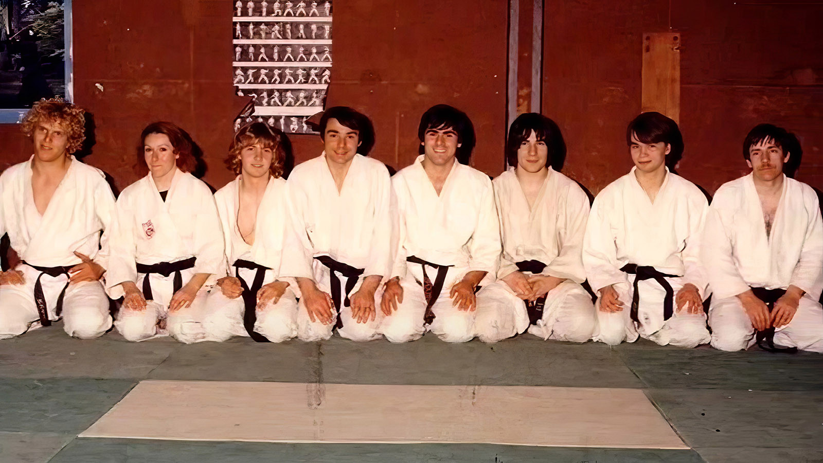 Les judokas Patrick O, Martine B, LOPEZ, Jean-Pierre B, Hervé B, Christian B, Christian R, Pierre B au Dojo en face du Hall Comminges en 1979