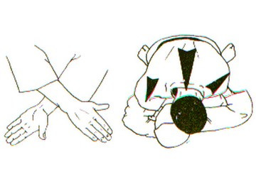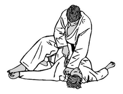 DESCRIPTION : Tori est à cheval sur Uke. Tori étrangle avec ses mains croisées, les deux paumes vers le bas. L'étranglement est effectué par l'appui des 2 poignets sur les carotides de Uke.