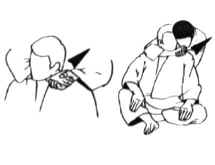 DESCRIPTION : Tori est à genoux derrière Uke, genou droit levé. Il passe son bras droit devant la gorge de Uke et le dos de sa main gauche sur l'épaule gauche de Uke. Il rejoint ses 2 mains, paume face à face et place le côté droit de sa tête sur la tempe gauche de Uke. L'étranglement se fait en déséquilibrant Uke vers l'arrière en tirant le bras droit dans la même direction.